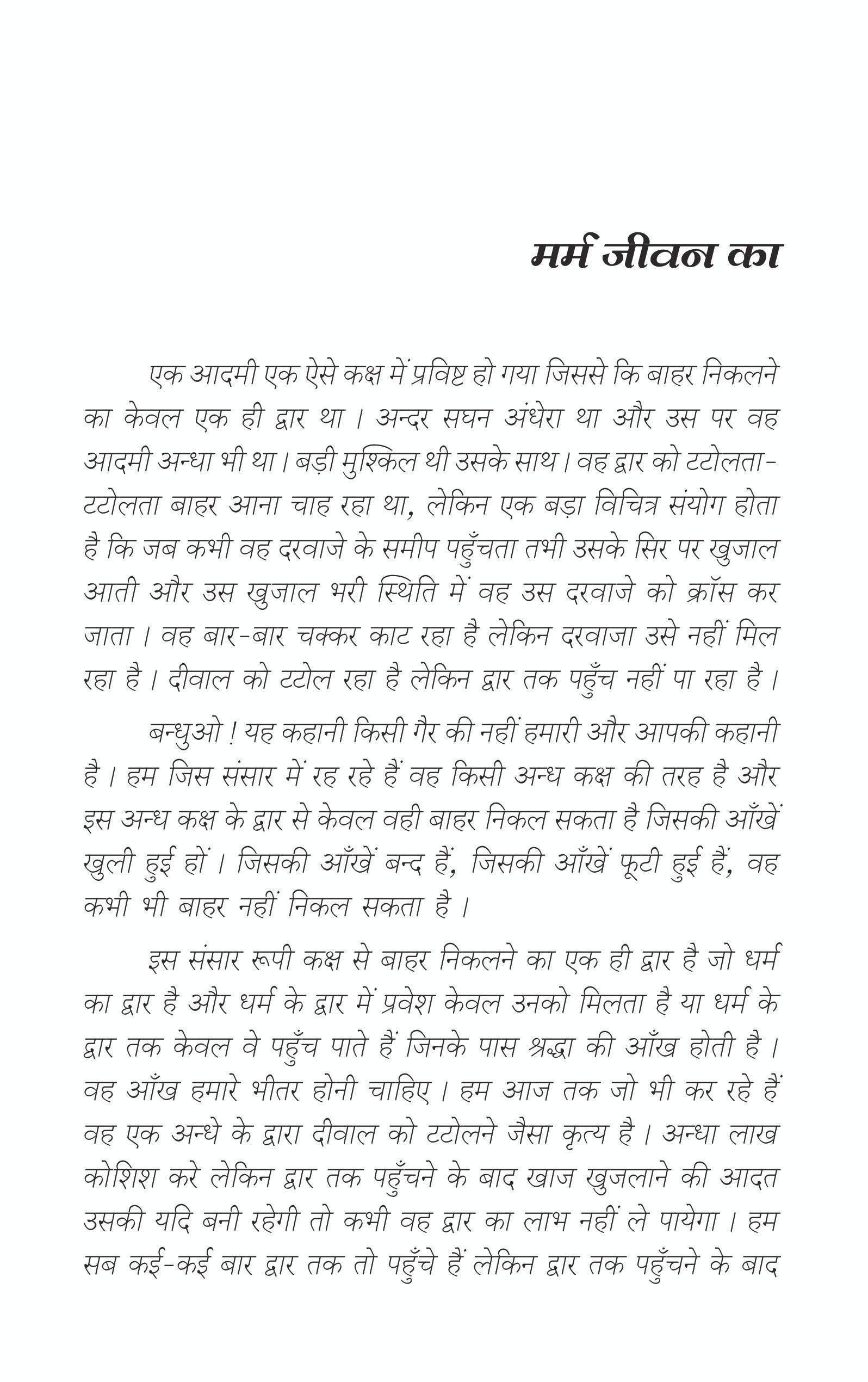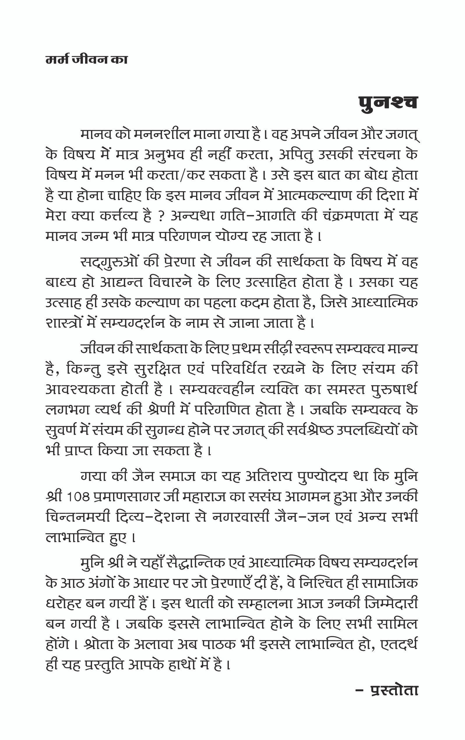 Marm Jivan ka-Part-1 is a thoughtful spiritual book by Muni Pramansagar Ji, offering deep insights into understanding life’s true essence. Through simple language and practical wisdom, it guides readers toward inner clarity, emotional balance, and conscious living. This book is ideal for anyone seeking meaningful self-improvement and spiritual growth.